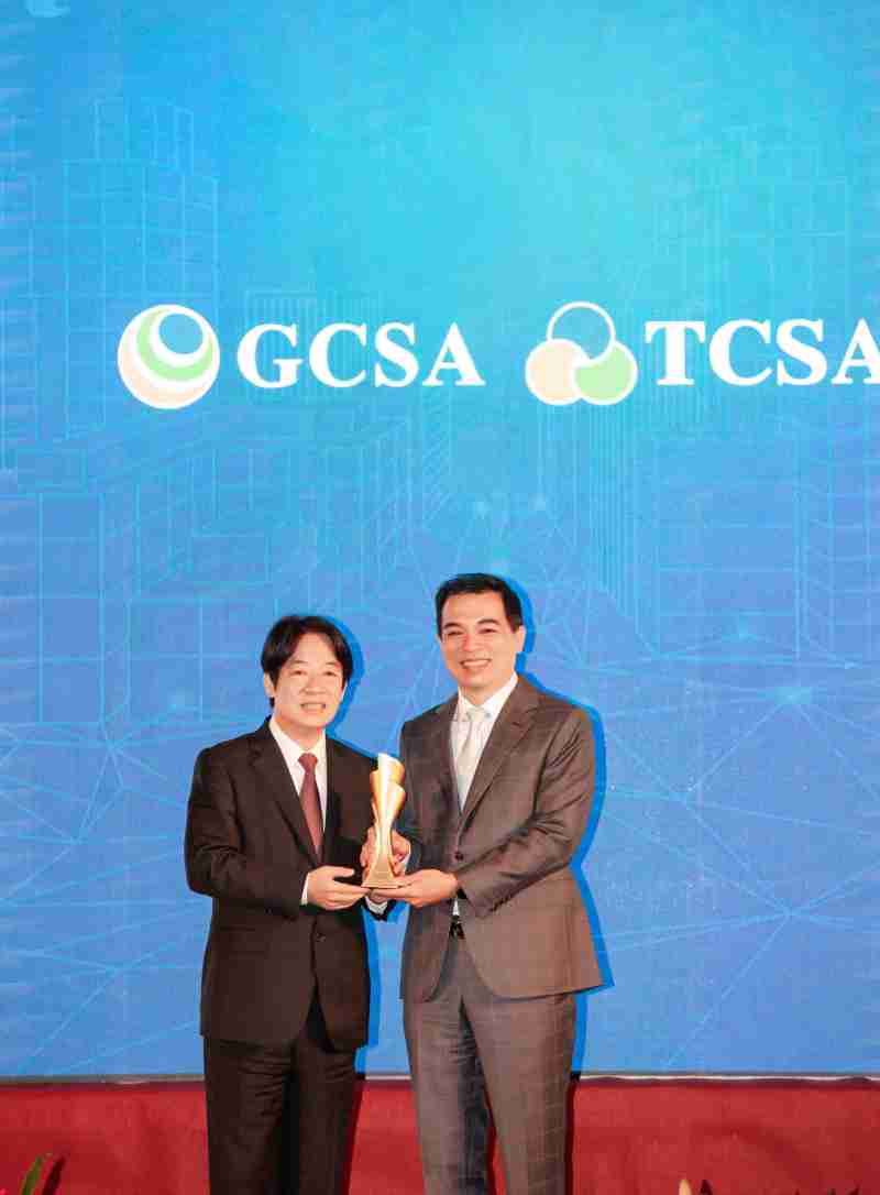 达全方位永续表现获全球永续奖及台湾永续奖肯定,,由副总统赖清德颁奖 (左),,,人生就是博总经理柯富仁 (右) 代表领奖