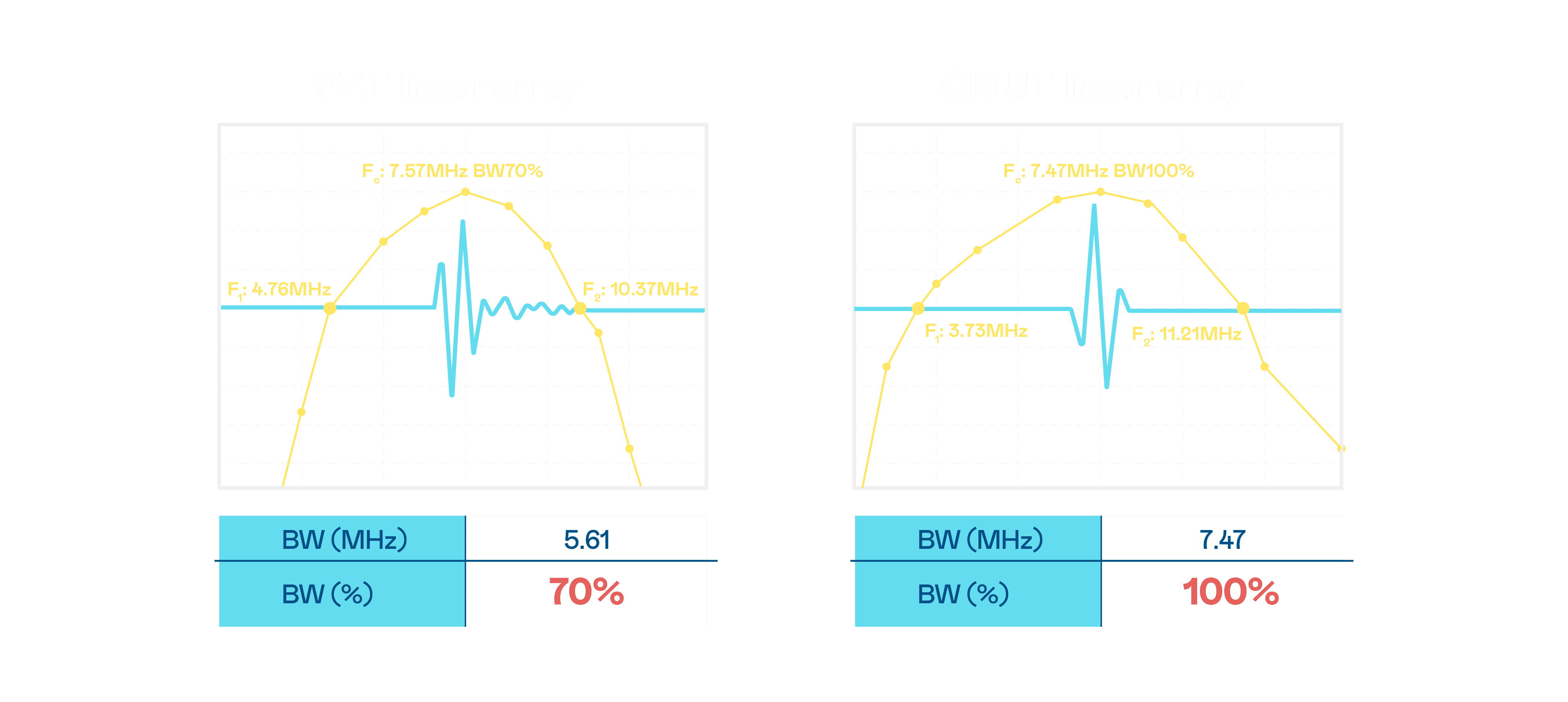 超音波影像的解析度高低,,,,首先取决于探头能发出的讯号频宽。。。人生就是博 CMUT 可提供高清晰的超音波讯号,,,,提供高频宽、、高灵敏度、、、影像纹理细节更高的超音波影像,,协助医护人员缩短影像判读时间及利用精准的医疗影像进行诊断。。。